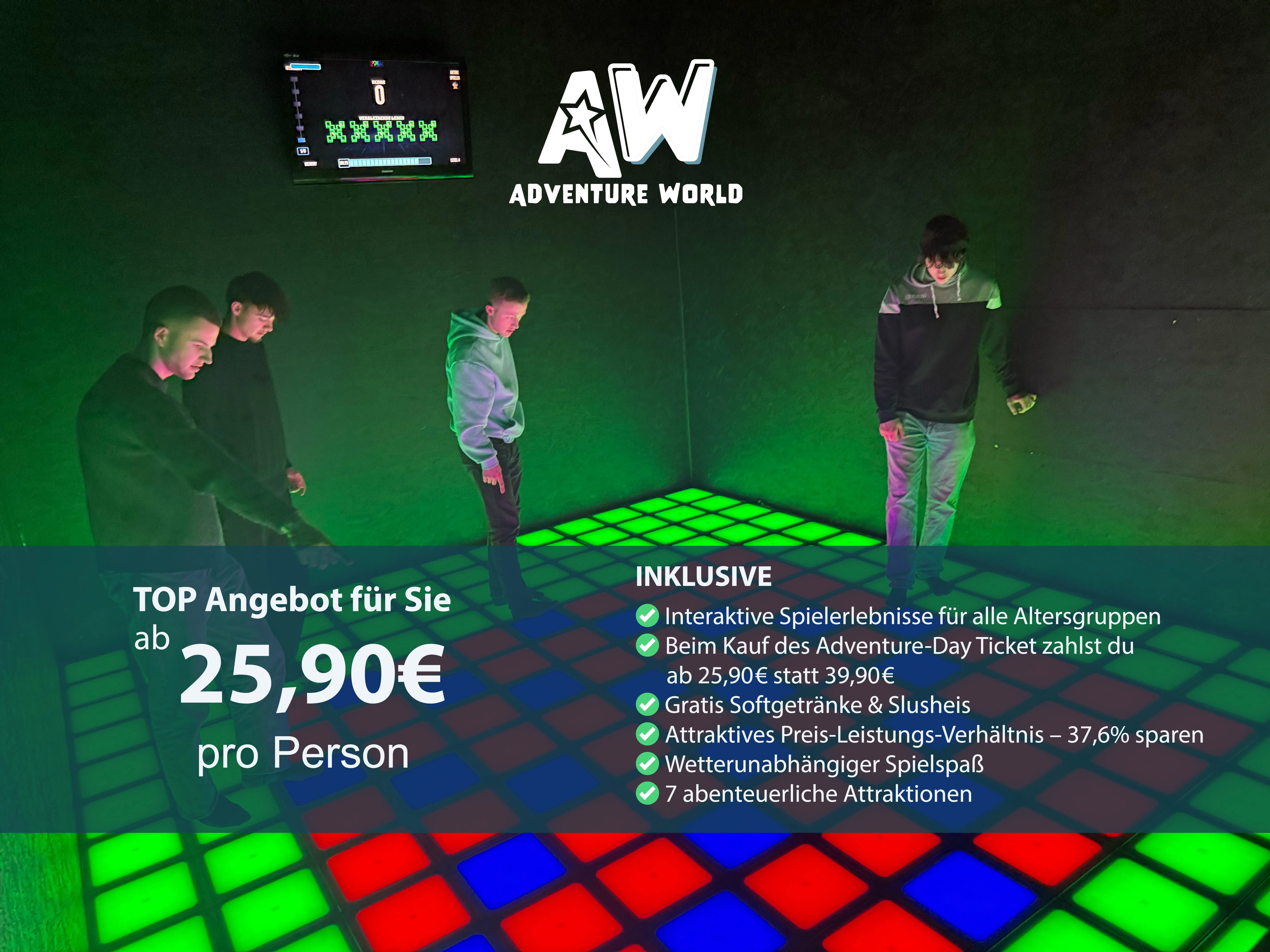 Unsere Preise sind familienfreundlich: Bereits ab 24,90 Euro kannst du 4 Stunden lang all unsere Attraktionen genießen. Die Adventure World ist der ideale Ort, um einen unvergesslichen Tag mit Freunden oder der Familie zu verbringen – mitten in der Metropolregion Ruhr!